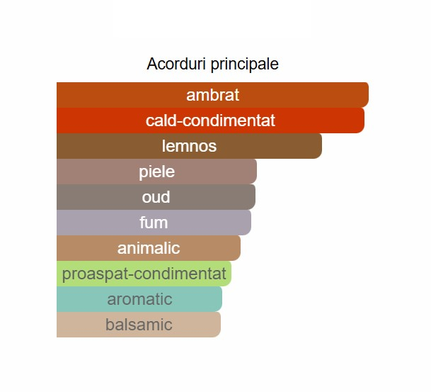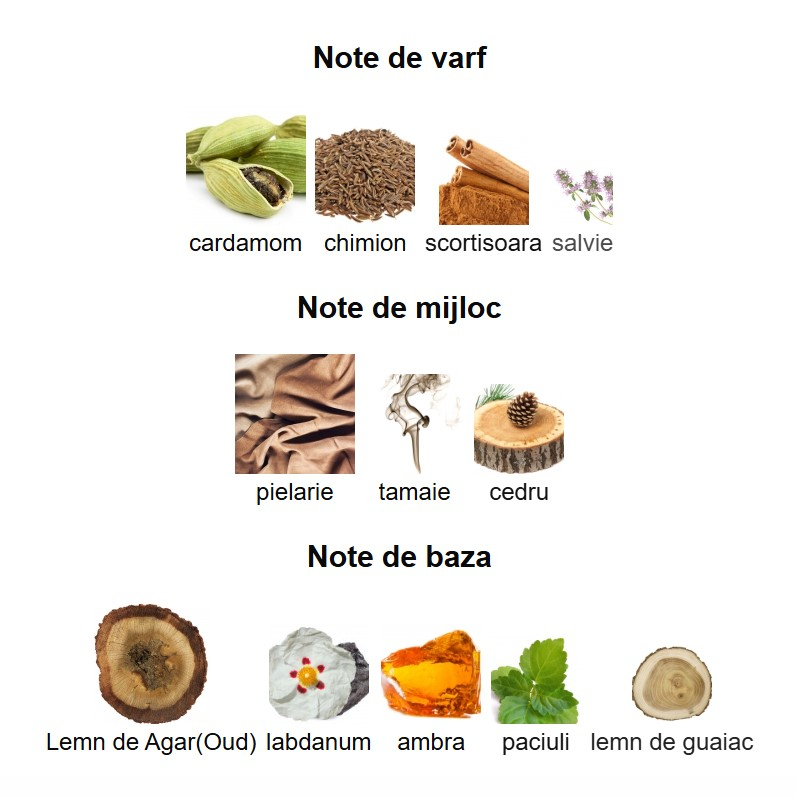 • Notele de baza: Lemn de Agar(Oud), labdanum, ambra, paciuli si lemn de guaiac.