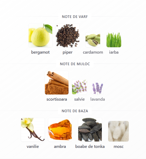 Note de Bază: Vanilie, Ambra, Boabe de Tonka, Mosc