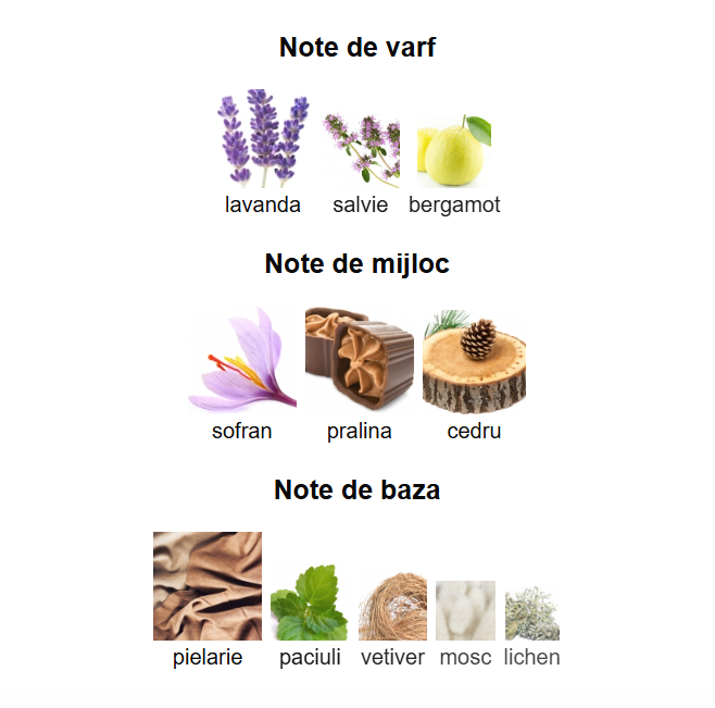 • Notele de baza: pielarie, paciuli, vetiver, mosc si lichen.