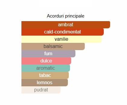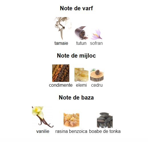 • Notele de baza: vanilie, rasina benzoica si boabe de tonka.