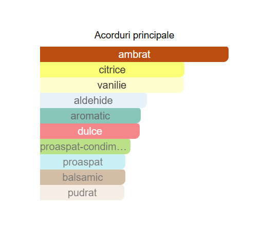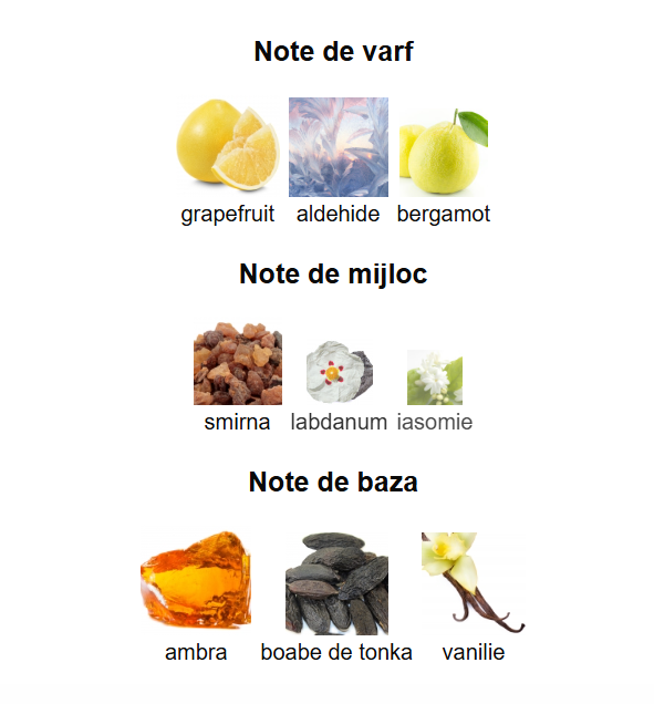 - Note de baza: ambra, boabe de tonka si vanilie.