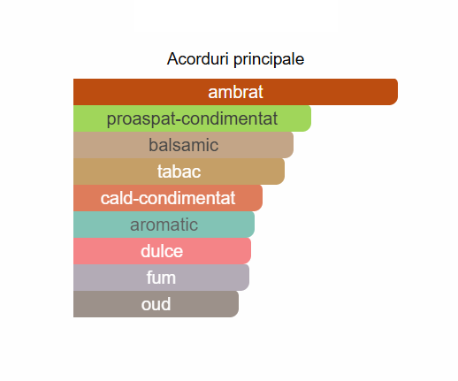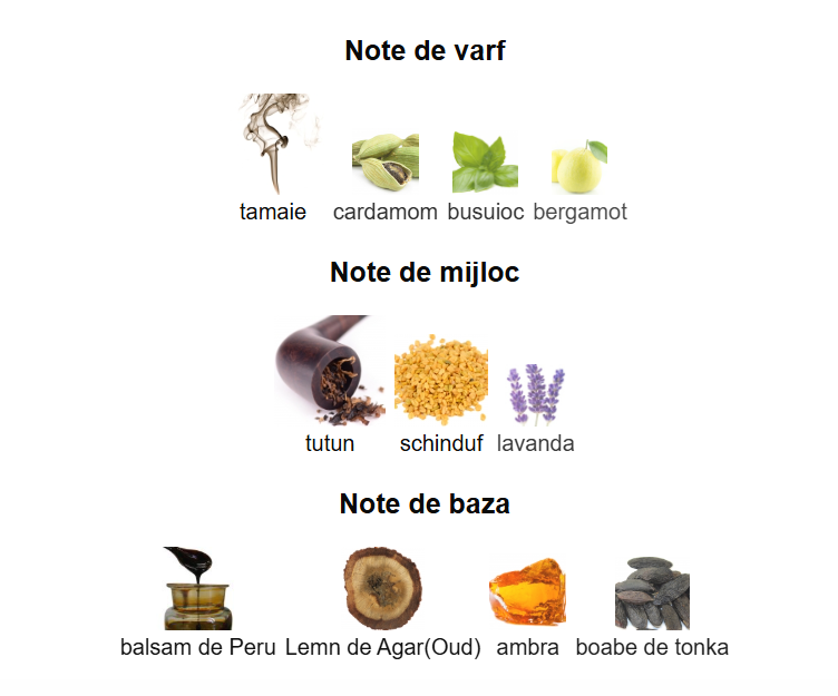 - Note de baza sunt balsam de Peru, Lemn de Agar(Oud), ambra si boabe de tonka.