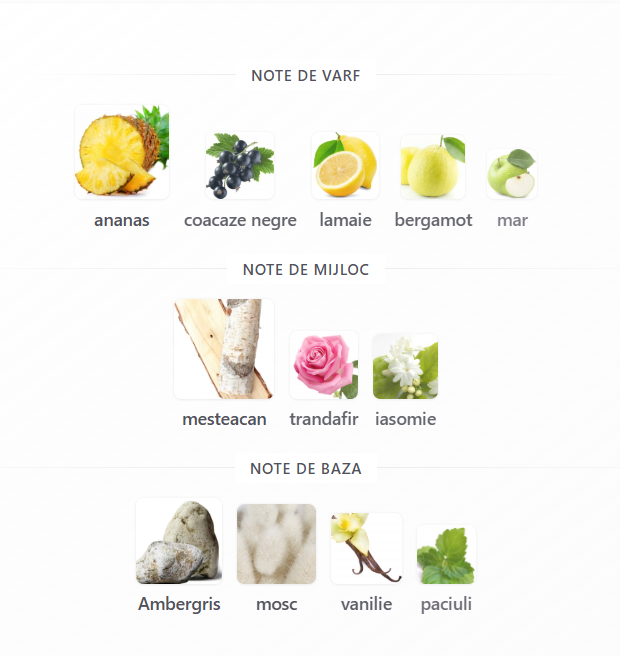 Note de Vârf: Lămâie, Bergamotă, Ananas, Coacăze Negre, Măr