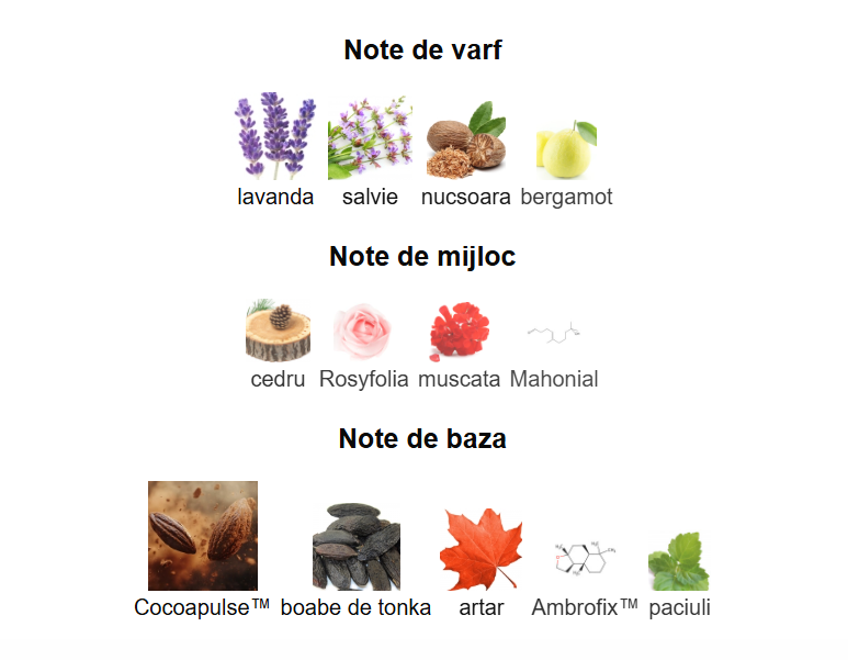 - Note de varf: lavanda, salvie, nucsoara si bergamot;