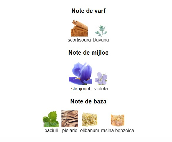 • Notele de baza: paciuli, pielarie, olibanum si rasina benzoica.